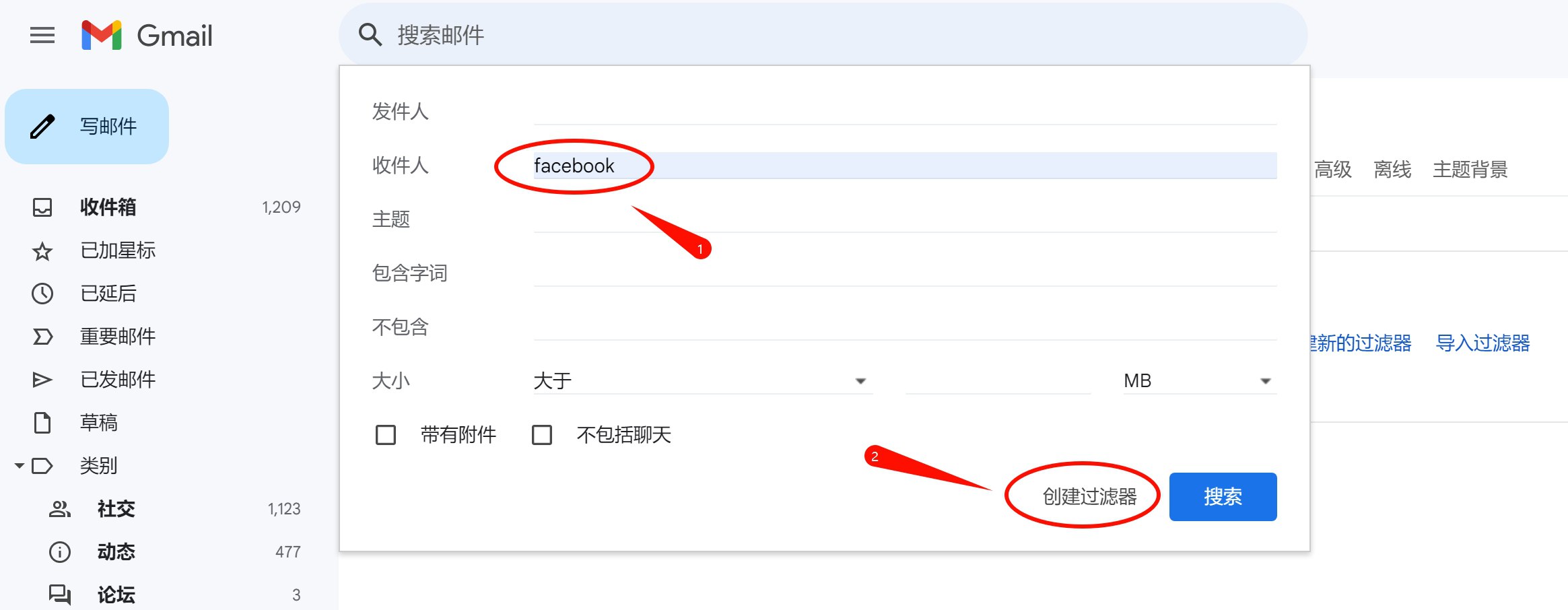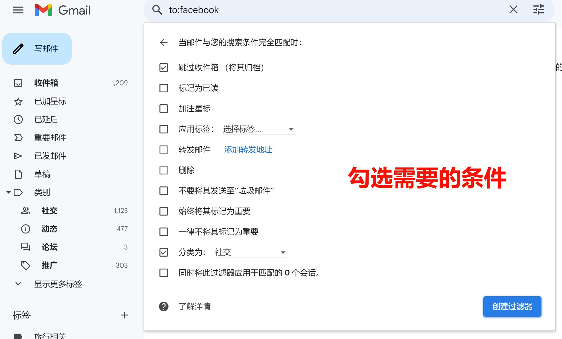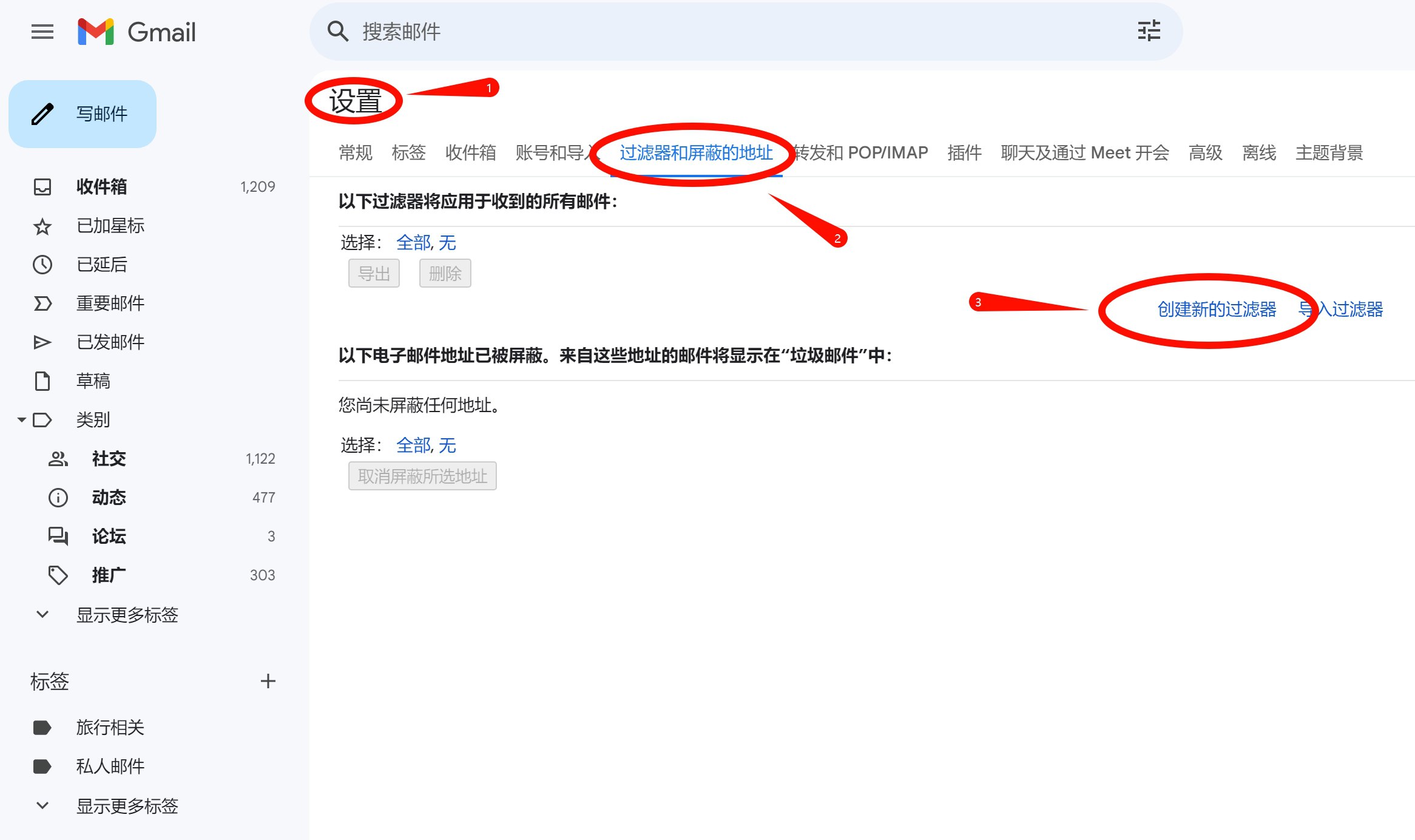 打开 Gmail → 设置 → 过滤器和屏蔽的地址 → 创建新的过滤器